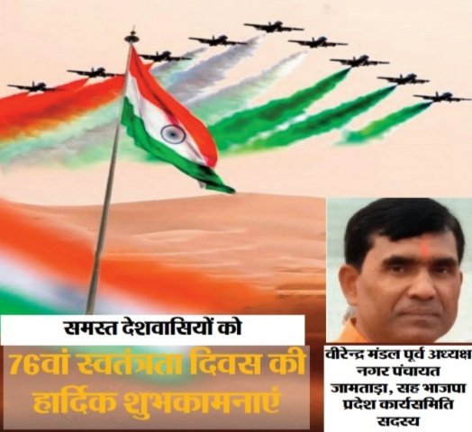 वीरेंद्र मंडल पूर्व अध्यक्ष नगर पंचायत जामताड़ा सह भाजपा प्रदेश कार्य समिति सदस्य की ओर से सभी देशवासियों को स्वतंत्रता दिवस की हार्दिक बधाई एवं ढेरों शुभकामनाएं