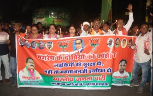 धनबाद । कोलकाता गैंगरेप के विरोध में भाजपा अनुसूचित जाति ने धनबाद रेलवे स्टेशन से डीआरएम चौक तक कैंडल मार्च निकाला। भाजपा नेत्री रागिनी सिंह ने कहा कि ममता बनर्जी की सरकार महिलाओं के सुरक्षा में फेल साबित हो चुकी है। बंगाल पुलिस भी ममता बनर्जी के इशारे पर नाच रही है। अगर इंसाफ नहीं मिला तो आगे आंदोलन को तेज किया जाएगा। ऐसी स्थिति है बेटियां खुद को डरी हुई महसूस कर रही हैं। एससी मोर्चा के जिलाध्यक्ष रामजीत भुइंया, प्रदेश उपाध्यक्ष राजेश पासवान, प्रदेश मीडिया प्रभारी बप्पी बाउरी, प्रकाश दास, रमा सिन्हा, फूल जोशी, बलराम हरि, राजेश हरि, बिनेश भुइंया, रंजीत दास, राजेश बाउरी, कन्हैया भुइंया, किरण देवी, रवि कुमार, संजय पासवान, बैजनाथ बाउरी, गौतम दास, बासुदेव ऋषि, योगेंद्र भुइंया, अमर कुमार उपस्थित थे।