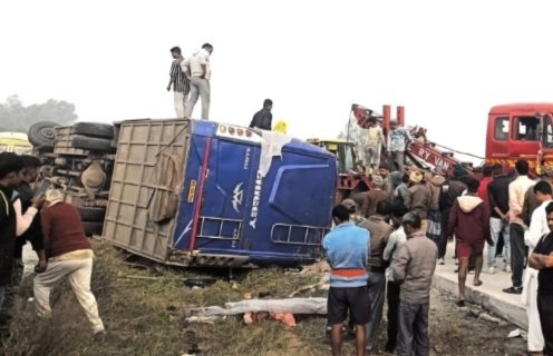 हजारीबाग । झारखंड के हजारीबाग जिले से एक भीषण सड़क हादसे की घटना सामने आई है । गुरुवार की अहले सुबह भीषण सड़क हादसा हुआ. इस घटना में 5 से अधिक लोगों की मौत हो गई है. जिले के बरकट्ठा थाना क्षेत्र के गोरहर में यह सड़क हादसा हुआ है. जहां गुरुवार की सुबह लगभग 6 बजे कोलकाता से पटना जा रही विशाल नामक यात्री बस संख्या डब्लू बी 76 ए – 1548 पलट गई. प्रत्यक्षदर्शियों के अनुसार हादसे में बस सड़क के किनारे पलट गई है और उस पर सवार कम से कम 5 यात्रियों की मौत हो गई. यह आंकड़ा और बढ़ भी सकता है. हादसे में 20 से अधिक यात्री घायल हो गए. घायलों की स्थिति गंभीर है. इस वजह से मरने वालों की संख्या बढ़ने की आशंका है. घटना के संबंध में बताया जा रहा है कि जहां दुर्घटना हुई, वहां सिक्स लेन सड़क निर्माण के दौरान कंपनी ने सड़क काट कर छोड़ दिया है. इस कारण बस अनियंत्रित हो गई और गड्ढे में पलट गई. हादसे के बाद आवाज बहुत दूर तक गुंजा और वहां चीख-पुकार मच गई. आवाज सुन कर आसपास के ग्रामीण घटनास्थल पर दौड़कर पहुंचे और गोरहर थाना की पुलिस को सूचना दी. पुलिस ने ग्रामीणों की मदद से घायलों को बाहर निकाला और सभी को इलाज के लिए अस्पताल पहुंचाया गया. खबर लिखे जाने तक मामले को लेकर जिला- प्रशासन की ओर से कोई आधिकारिक बयान सामने नहीं आया है ।