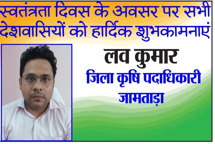 लव कुमार जिला कृषि पदाधिकारी जामताड़ा की ओर से समस्त देशवासियों को 15 अगस्त, स्वतंत्रता दिवस की हार्दिक बधाई एवं ढेरों शुभकामनाएं ।