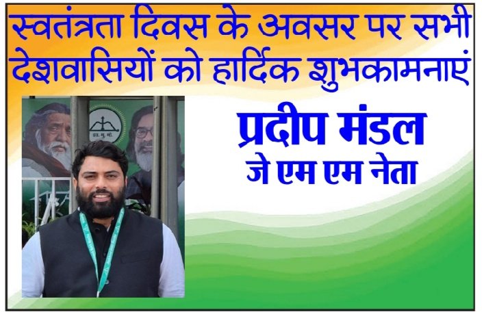 प्रदीप मंडल जे एम एम नेता जामताड़ा की ओर से समस्त देशवासियों को 15 अगस्त, स्वतंत्रता दिवस की हार्दिक बधाई एवं ढेरों शुभकामनाएं ।