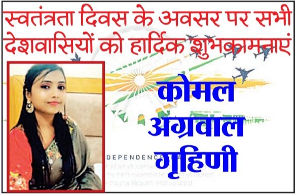 कोमल अग्रवाल की ओर से समस्त देशवासियों को 15 अगस्त स्वतंत्रता दिवस की हार्दिक बधाई एवं ढेरों शुभकामनाएं । Post navigation रोहित बुक सेंटर, लक्ष्मीनिया मोड़ झरिया की ओर से समस्त देशवासियों को 15 अगस्त स्वतंत्रता दिवस की हार्दिक बधाई दीपक अग्रवाल, युवा व्यवसाई और समाजसेवी, झरिया की ओर से समस्त देशवासियों को 15 अगस्त स्वतंत्रता दिवस की हार्दिक बधाई