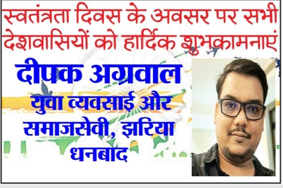 दीपक अग्रवाल, युवा व्यवसाई और समाजसेवी, झरिया ( धनबाद) की ओर से समस्त देशवासियों को 15 अगस्त स्वतंत्रता दिवस की हार्दिक बधाई एवं ढेरों शुभकामनाएं ।