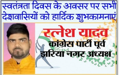 रत्नेश यादव, कांग्रेस पार्टी पूर्व झरिया नगर अध्यक्ष ओर से समस्त देशवासियों को 15 अगस्त स्वतंत्रता दिवस और कृष्ण जन्माष्टमी की हार्दिक बधाई एवं ढेरों शुभकामनाएं ।