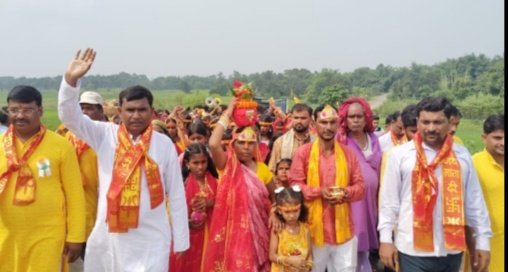 जामताड़ा । सोमवार को भाजपा वरिष्ठ नेता वीरेंद्र मंडल नवरात्रा के सुअवसर पर नारायणपुर प्रखंड अंतर्गत मीरगा गांव में आयोजित कलश यात्रा में मुख्य अतिथि के रूप में सम्मिलित हुए। मिरगा ग्राम १६ आना समिति के सानिध्य में नवरात्रा के सुअवसर पर माता रानी की पूजा अर्चना हेतु मुख्य यजमान शिबू मंडल के घर में कष्ट निवारण हेतु माता रानी की कृपा से कलश स्थापना के सुअवसर पर बड़े ही धूमधाम से कलश यात्रा का आयोजन किया गया।इस कलश यात्रा में सैकड़ों की संख्या में ग्रामीण माताएं बहने और भक्तजन सम्मिलित हुए।भाजपा वरिष्ठ नेता वीरेंद्र मंडल ने अपने संबोधन में कहा कि सर्वप्रथम में सभी जामताड़ा जिले वासियों को नवरात्रा की ढेर सारी शुभकामनाएं एवं बधाई।माता रानी से मेरी आराधना हैं कि समस्त जामताड़ा जिले वासी का जीवन सुखी समृद्ध और मंगलमय हो।आज जामताड़ा विधानसभा क्षेत्र अंतर्गत नारायणपुर प्रखंड स्थित मिरगा गांव में नवरात्रा के सुअवसर पर कलश स्थापना के शुभ दिवस ग्राम १६ आना समिति के सानिध्य में भव्य रूप से कलश यात्रा का आयोजन किया गया।माता रानी के भक्त शिबू मंडल के घर में कष्ट निवारण हेतु माता रानी की कृपा पिछले कई वर्षों से कलश यात्रा के साथ कलश स्थापना की परंपरा निभाई जा रही है।इस कलश यात्रा में ग्रामीण माताएं बहने बड़े ही उत्साह पूर्वक भाग लिया सभी माथे में कलश लेकर गांव के समीप नदी से हिन्दू रीति रिवाज से जल भरा।29 सितंबर को मिरगा ग्राम में धार्मिक झांकी और भक्ति जागरण का भी आयोजन किया गया हैं।माता रानी के सभी भक्तों से आग्रह हैं कि इस धार्मिक कार्यक्रम में बढ़ चढ़कर भाग ले ।मौके पर मुख्य रूप से मुखिया कृष्णा,संजय ओझा ,गोवर्धन मंडल,भूदेव मंडल, परमेश्वर मंडल, संजीत कुमार ,मुकेश मंडल ,बलराम मंडल अमीन मंडल, रोहित मंडल, विशाल मंडल ,प्रदीप मंडल सहित सैकड़ों की संख्या में ग्रामीणजन उपस्थित रहे।
