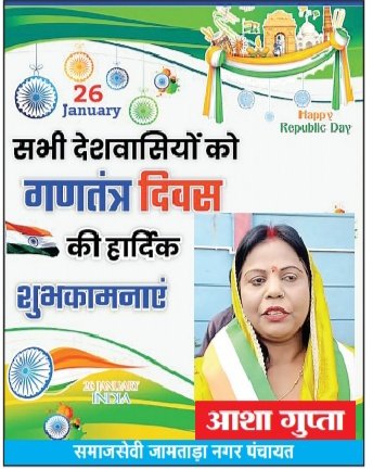 जामताड़ा । आशा गुप्ता समाजसेवी जामताड़ा नगर पंचायत की ओर से समस्त देशवासियों को 26 जनवरी 2026 गणतंत्र दिवस की हार्दिक बधाई एवं ढेरों शुभकामनाएं ।