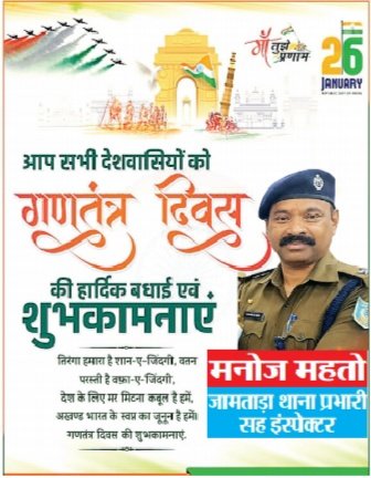 जामताड़ा । मनोज महतो जामताड़ा थाना प्रभारी सह इंस्पेक्टर की ओर से समस्त देशवासियों को 26 जनवरी 2026 गणतंत्र दिवस की हार्दिक बधाई एवं ढेरों शुभकामनाएं ।