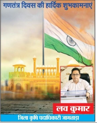 जामताड़ा । लव कुमार जिला कृषि पदाधिकारी जामताड़ा की ओर से समस्त देशवासियों को 26 जनवरी 2026 गणतंत्र दिवस की हार्दिक बधाई एवं ढेरों शुभकामनाएं ।