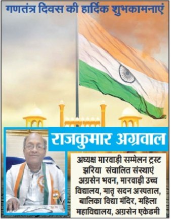 झरिया । राजकुमार अग्रवाल अध्यक्ष मारवाड़ी सम्मेलन ट्रस्ट झरिया की ओर से समस्त देशवासियों को 26 जनवरी 2026 गणतंत्र दिवस की हार्दिक बधाई एवं ढेरों शुभकामनाएं
