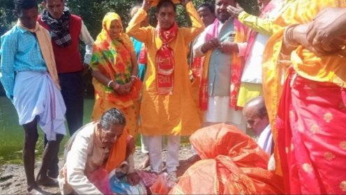जामताड़ा । आज फतेहपुर प्रखण्ड क्षेत्र के खट्टोजोरी गाँव में महाशिवरात्रि के शुभ अवसर पर श्रीमद् भागवत कथा निमित्त भव्य कलश शोभायात्रा गाजे बाजे के साथ भगवान भोलेनाथ के मंदिर से निकाला गया। इस भव्य कलश यात्रा में हजारो के तादाद में श्रद्धालुओं ने बड़ चड़ कर भाग लिया ब्राह्मण आचार्य के सानिध्य द्वारा वैदिक मंत्रों उच्चारण के साथ वैदिक विधान के साथ पुजा अर्चना के साथ 108 कुवांरी कन्या आदि ने मंगल कलश में जल लेकर श्रद्धालुओं ने अधर्म का नाश हो धर्म का जय हो राधा राधा जय श्री कृष्ण हर हर महादेव के गगनभेदी उदघोष के साथ कतार वद्ध होकर माथे मे कलश लेकर कलश शोभायात्रा आरंभ हुआ। इस भक्तिमय अनुष्ठान के आयोजन से क्षेत्र में भक्तिमय हो उठा, इस भव्य कलश शोभायात्रा में पुर्व कृषि मंत्री सत्यानंद झा, भाजपा नेता मनोज गोस्वामी, वरिष्ठ नेता विष्णु मंडल, भाजपा युवा नेता सुरज झा, समाजसेवी गण गन्य मान्य अतिथि गण ने बड़ चड़कर भाग लिये।