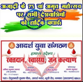 आदर्श युवा संगठन की ओर से आजादी के अमृत महोत्सव पर सभी देशवासियों को हार्दिक बधाई Post navigation धनबाद : अभियान प्लाई परिसर में अजय अग्रवाल ने किया झंडोत्तोलन अभियान प्लाई की ओर से आजादी के अमृत महोत्सव पर सभी देशवासियों को हार्दिक बधाई