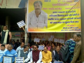 धनबाद । आज रणधीर वर्मा चौक में एक दिवसीय धरना दी गई । यह धरना जमीन कारोबारी अजय पासवान की हत्या 5 दिसम्बर की रात हुई थी शादी समारोह में गए थे तभी उक्त घटना घटी।इस मामले में अंजनी पासवान ने कहा की मेरे पति की हत्या साजिश के तहत की गई है।हत्यारो को कड़ी से कड़ी सजा दी जाए।जिला पुलिस प्रशासन से अपील करती हू की मुझे न्याय मिले।