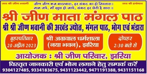 झरिया । मां जीण परिवार झरिया द्वारा हर वर्ष की भांति इस वर्ष भी मां जीण परिवार का दरबार दिनाकर 20/4/2023 गुरुवार को अग्रवाल धर्मशाला नया भवन झरिय में भव्य दरबार सजेगा माता का मंगल पाठ सरोज शर्मा एवंम सरिता जालुका द्वारा किया जायेगा। यह कार्यक्रम विगत 2015 से हर वर्ष किया जाता है । इसमें माता का दरबार, मंगल पाठ , ज्योत, श्रृंगार, छप्पन भोग, फलों का भोग, बुंदिया भोग , पेडा भोग एवं भण्डारा का भी आयोजन किया जाता है । कार्यक्रम को सफल बनाने में नरेश अग्रवाल , शिव कुमार अग्रवाल, नवीन पोदार, जयप्रकाश मोदी , विनोद मोदी , गणेश मोदी , शरद शर्मा , मंजुलता शर्मा , मिना अग्रवाल , आशा अग्रवाल , सन्तोष अग्रवाल, सुनीटा अनुवाल , रश्मि अग्रवाल , अल्पना अग्रवाल , बन्दना खण्डेलवाल , उषा अग्रवाল, मीना अग्रवाल , भगवडी अग्रवाल , संजय अग्रवाल आदि लोग उपस्थित थे ।